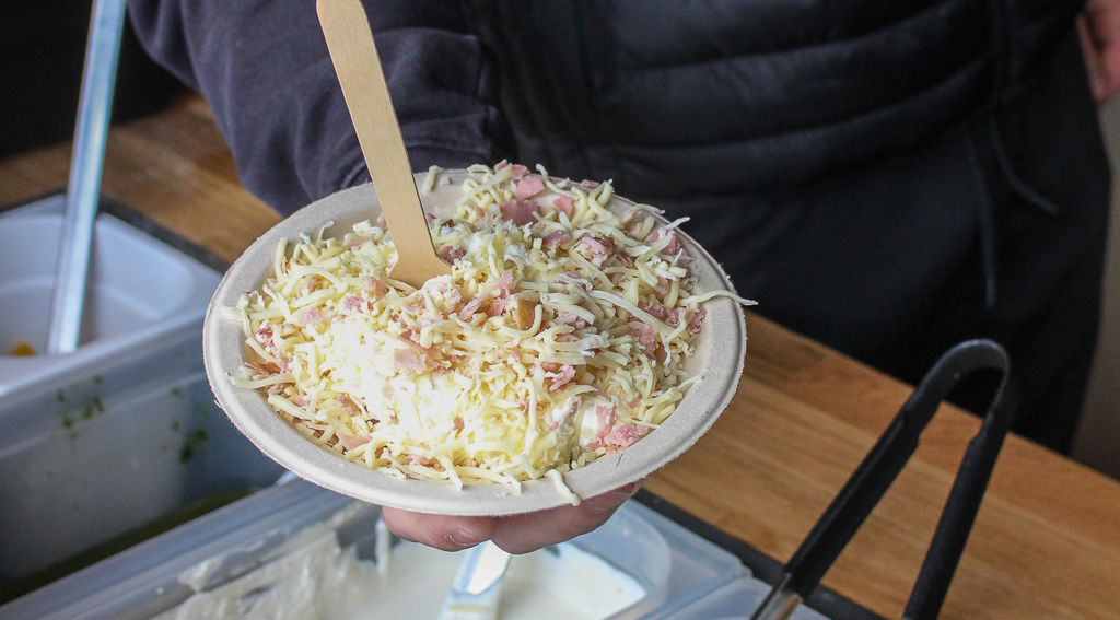 Frische, österreichische Kartoffeln, klassisch gebacken im Ofenkartoffelofen – das bieten wir auf dem Ostermarkt Schönbrunn. Ob mit Butter und Salz, Speck und Zwiebeln, Knoblauch-Rahmsauce. Auch eine frische vegane Variante ist dabei, Tomaten-Paprika Letscho, unsere Vielfalt lässt keine Wünsche offen. Die hausgemachten Saucen werden täglich frisch zubereitet, denn Qualität steht bei uns an erster Stelle. Dazu servieren wir Weine und an kalten Tagen Glühwein aus dem eigenem Weingut "Der Fuchs" in Brunn am Gebirge. Seit über 25 Jahren begeistern wir die Besucher des Weihnachtsmarkts und freuen uns darauf, auch Sie von unserer Qualität zu überzeugen.